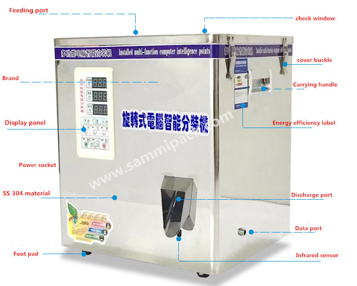 Suitable for tea, food, grain, seeds, herb,nut, medicine, chemicals and pharmaceuticals, micro and small components such as general non-sticky solid materials.